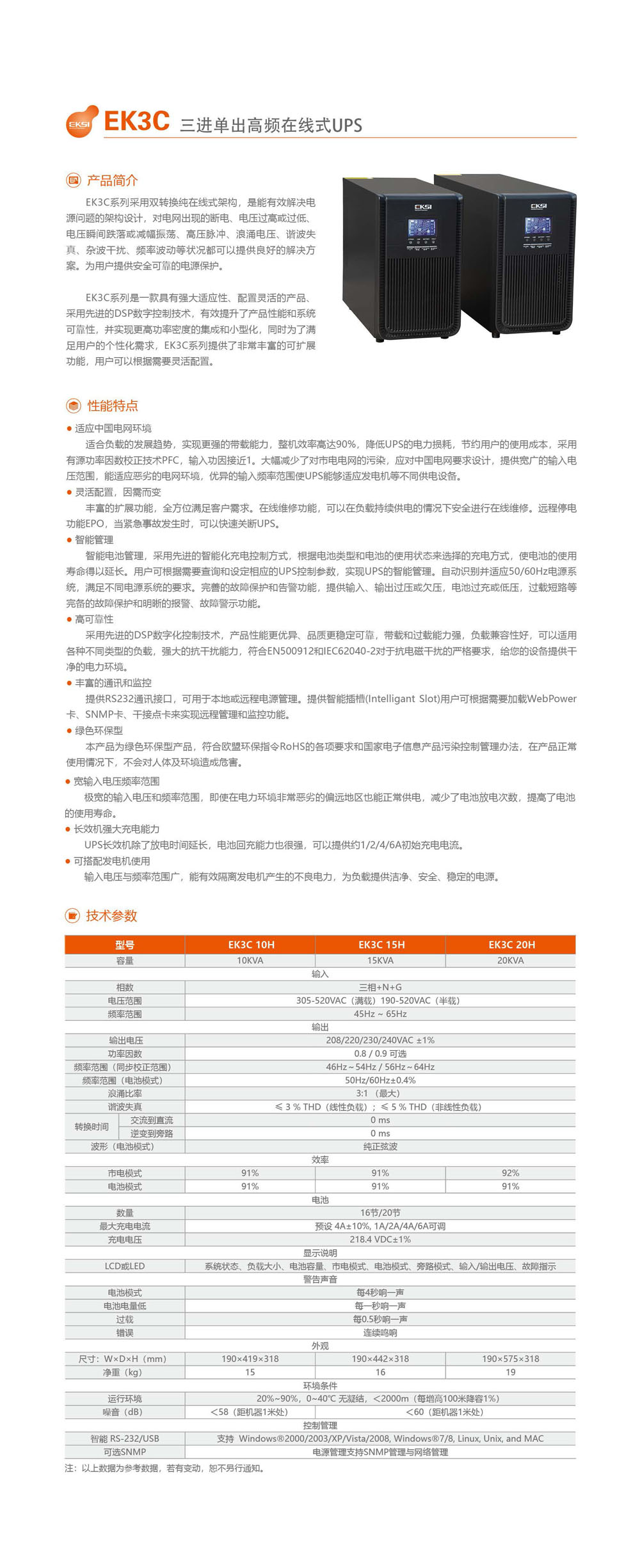 功率:10–20 kVA 電壓:220 / 230 / 240 V 安裝方式:塔式